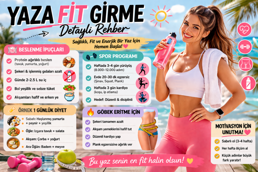 Yaza fit girmek için mucize yoktur. Disiplinli beslenme + spor + uyku üçlüsü başarı getirir. Küçük ama sürdürülebilir adımlar en büyük değişimi sağlar.